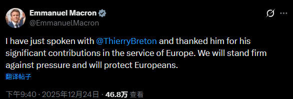 法国总统马克龙则为法国公民“撑腰”。他同日在X平台发文表示,已与布雷顿通话并感谢其工作,“我们不会放弃,将继续保护欧洲的独立性和欧洲人的自由”。