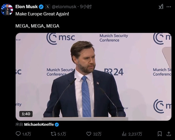 早在今年2月,美国副总统万斯就在慕尼黑安全会议发表演讲,毫不客气地痛批欧洲,被媒体认为是向欧洲发起了“残酷的意识形态攻击”。他当时表示,欧洲面临的真正威胁并非来自俄罗斯或中国等外部势力,而是欧洲自身内部对其“最基本价值观”的背离。